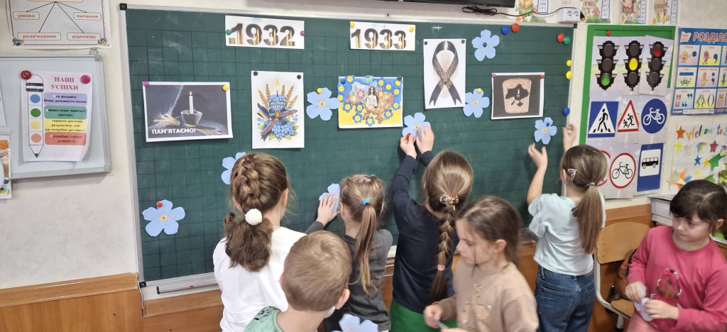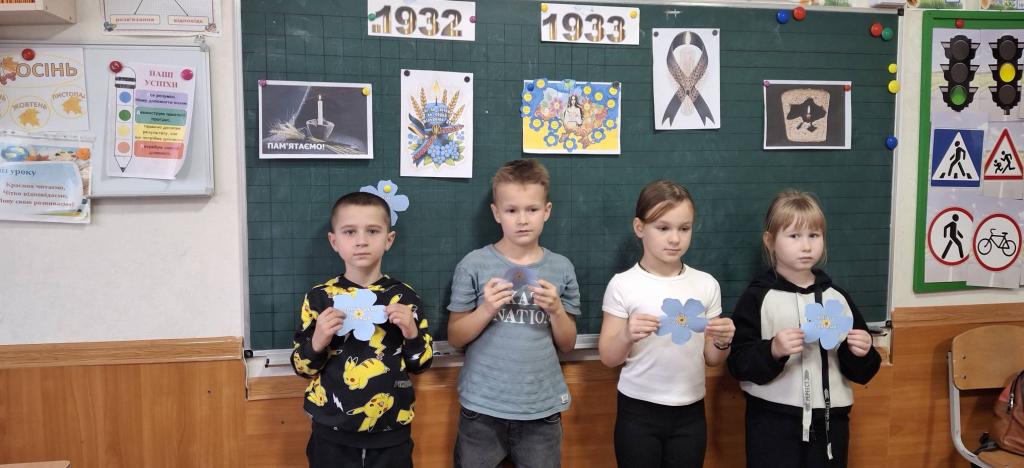 Сьогодні День пам’яті жертв Голодомору. Тому напередодні у 2-Б класі відбувся захід приурочений цій даті – ” Ніколи не забудемо”. Ми говорили про важкі часи в Україні 1932 – 1933рр. Діти дізналися про те, як страждали люди, а особливо маленькі діти. Переглянули мультфільм про важке голодне життя маленької дівчинки, перейнялися її долею. Учні висловлювали свої думки – чому треба берегти, цінувати хліб, чому слід пам’ятати історію нашого народу. Виготовили символічну квіточку – незабудку – ” Пам’ятаємо! Не забуваємо!”
