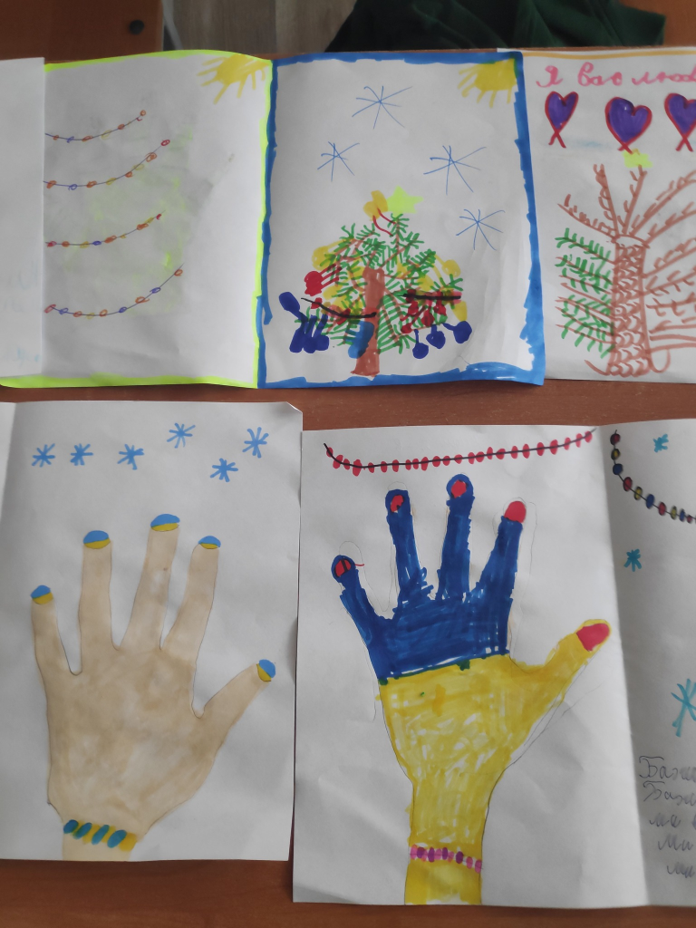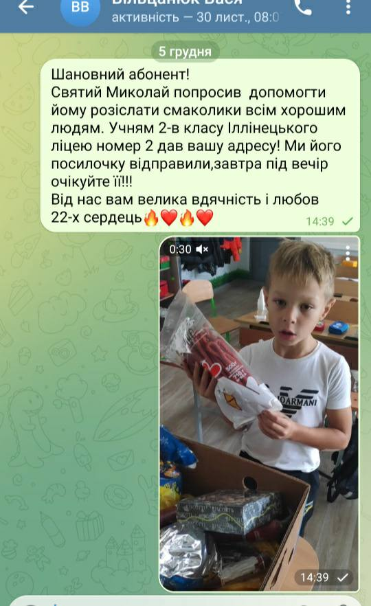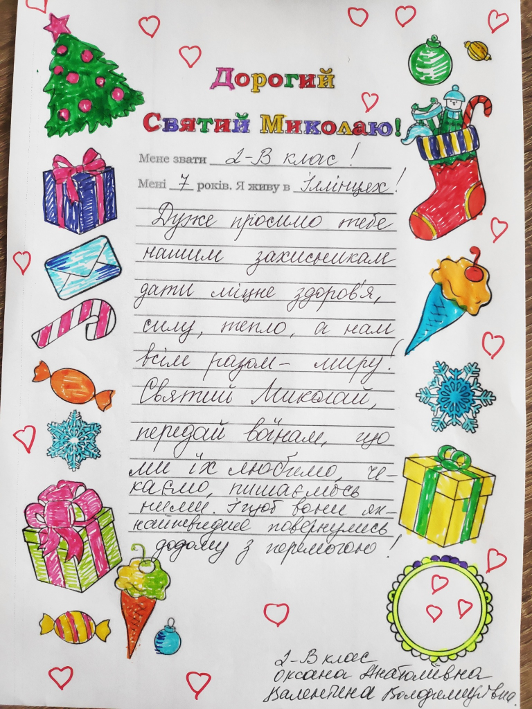 А ще Святий Миколай трішки не встигав доставити подарунки на передову захисникам, то ми йому допомогли і відправили в м.Суми адресну посилку, в яку вклали смаколики і колективного листа Миколаю від усього класу з проханнями про мир, перемогу, про захист наших воїнів.