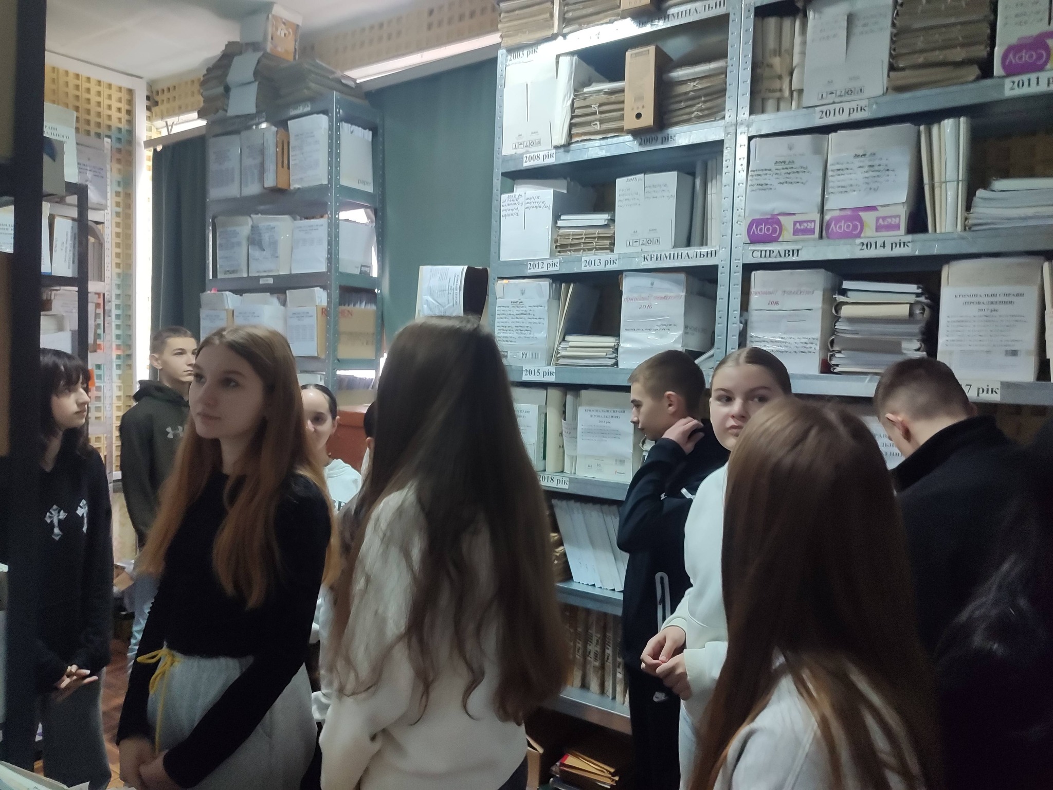 Зустріли учнів працівники служби судової охорони і ознайомили із порядком пропуску осіб до приміщення суду та роботою судової охорони. З привітальним словом звернулась до учнів керівник апарату суду Оксана Самофал провела екскурсію судом, показала архів суду та розповіла про терміни зберігання справ і процес їх знищення, зберігання речових доказів.