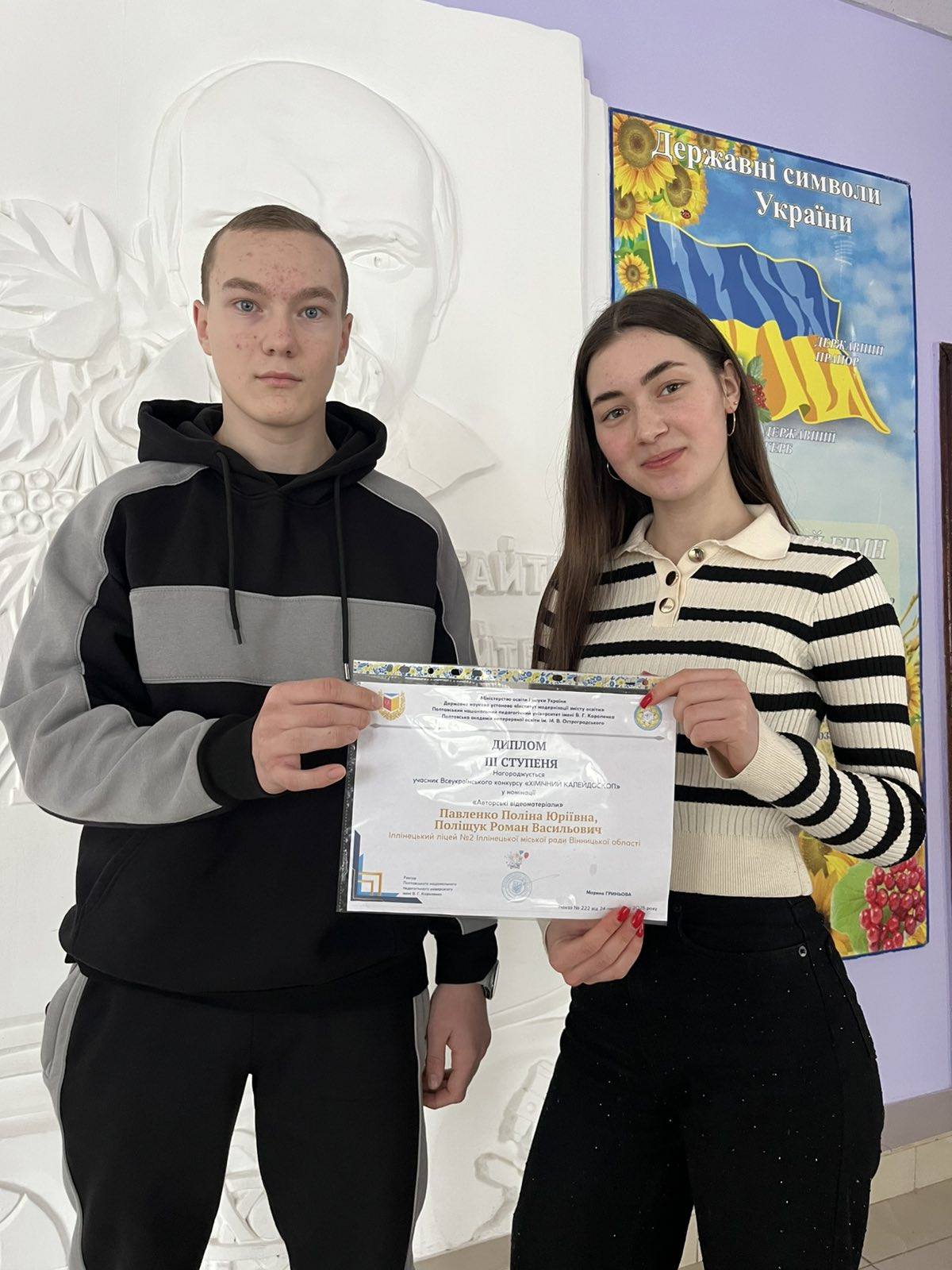 • Павленко Поліна та Поліщук Роман (10-Б клас) — у номінації «Авторські відеоматеріали»;