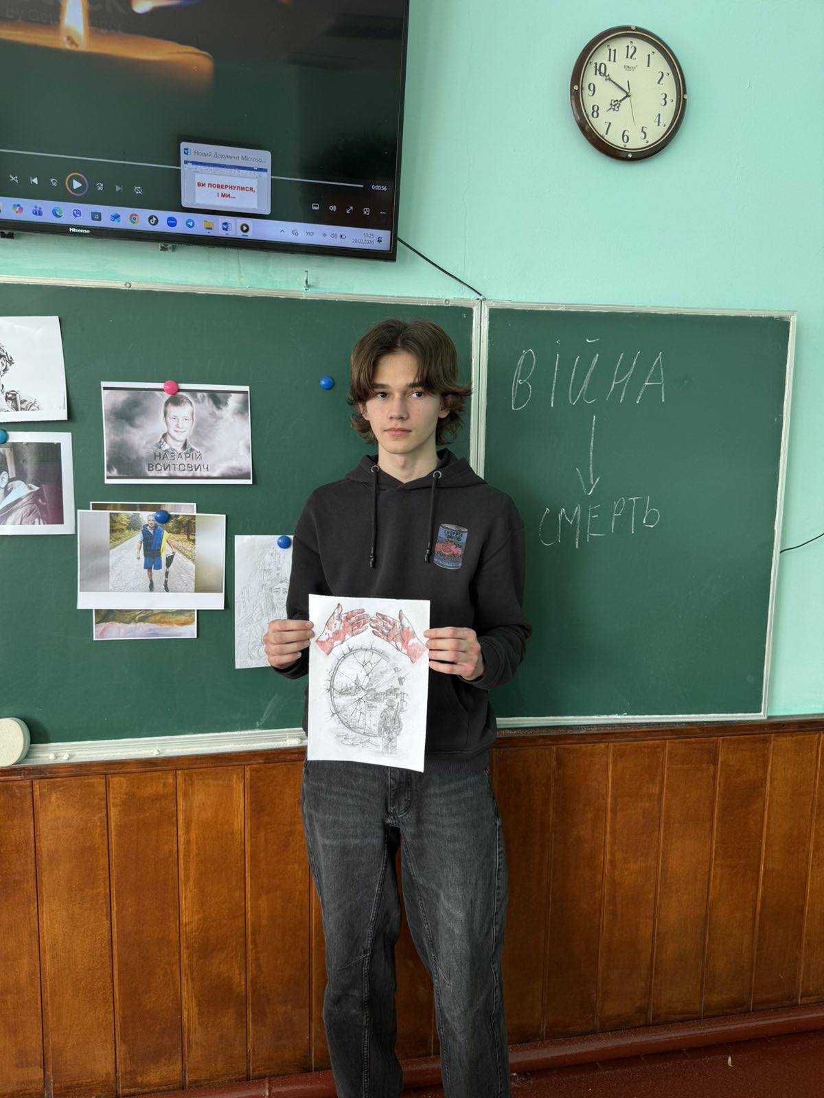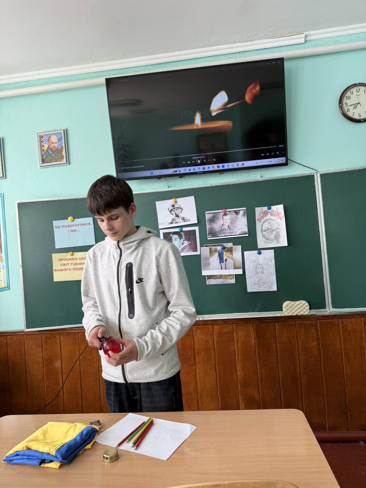 Під час уроку-реквієму одинадцятикласники відтворили хроніку подій на Майдані, вшанували пам’ять загиблих хвилиною мовчання та символічно запалили «промені гідності». Самовідданість Героїв Небесної Сотні стала фундаментом нашої сьогоднішньої незламності, стійкості та віри в ПЕРЕМОГУ.