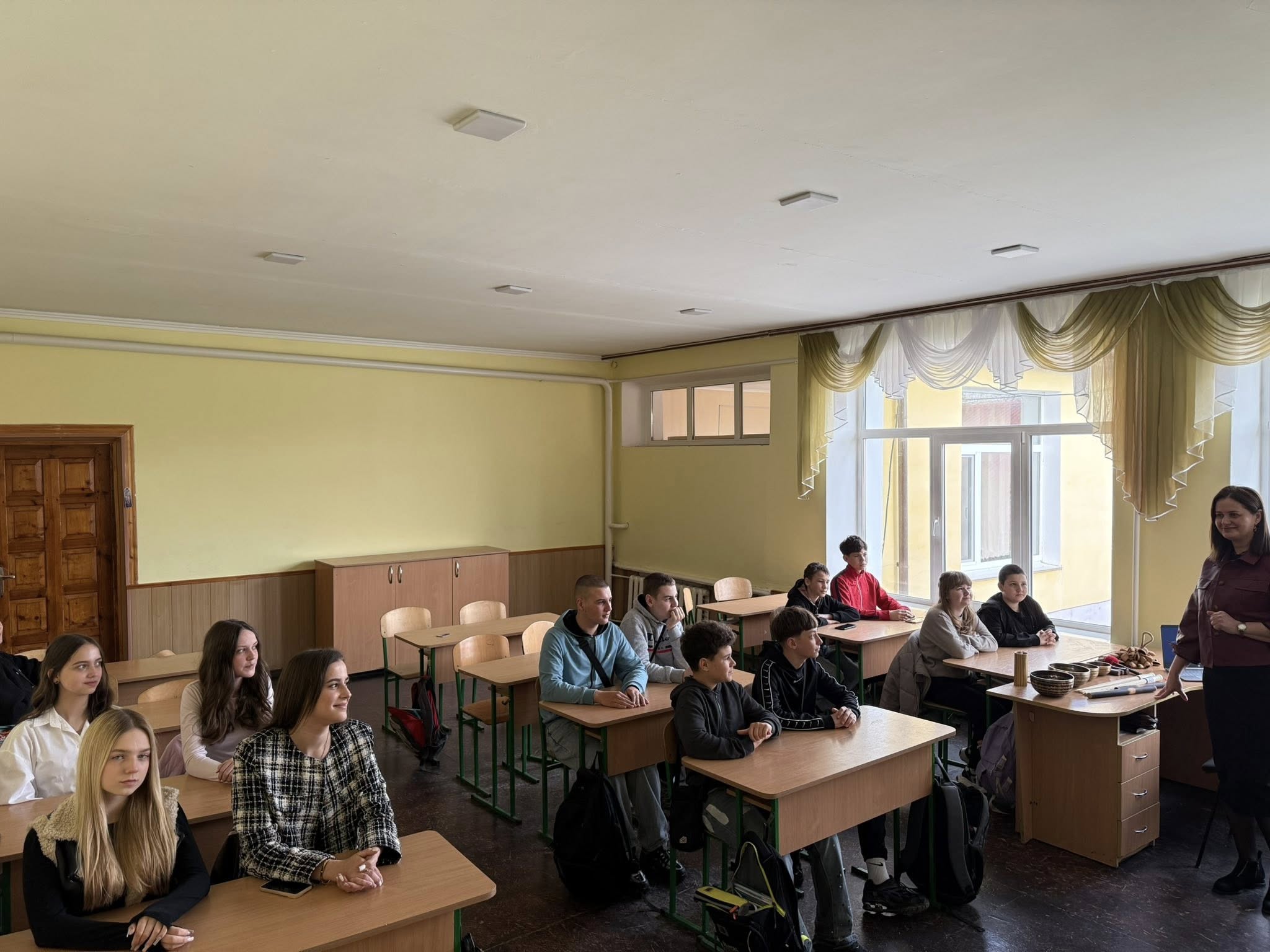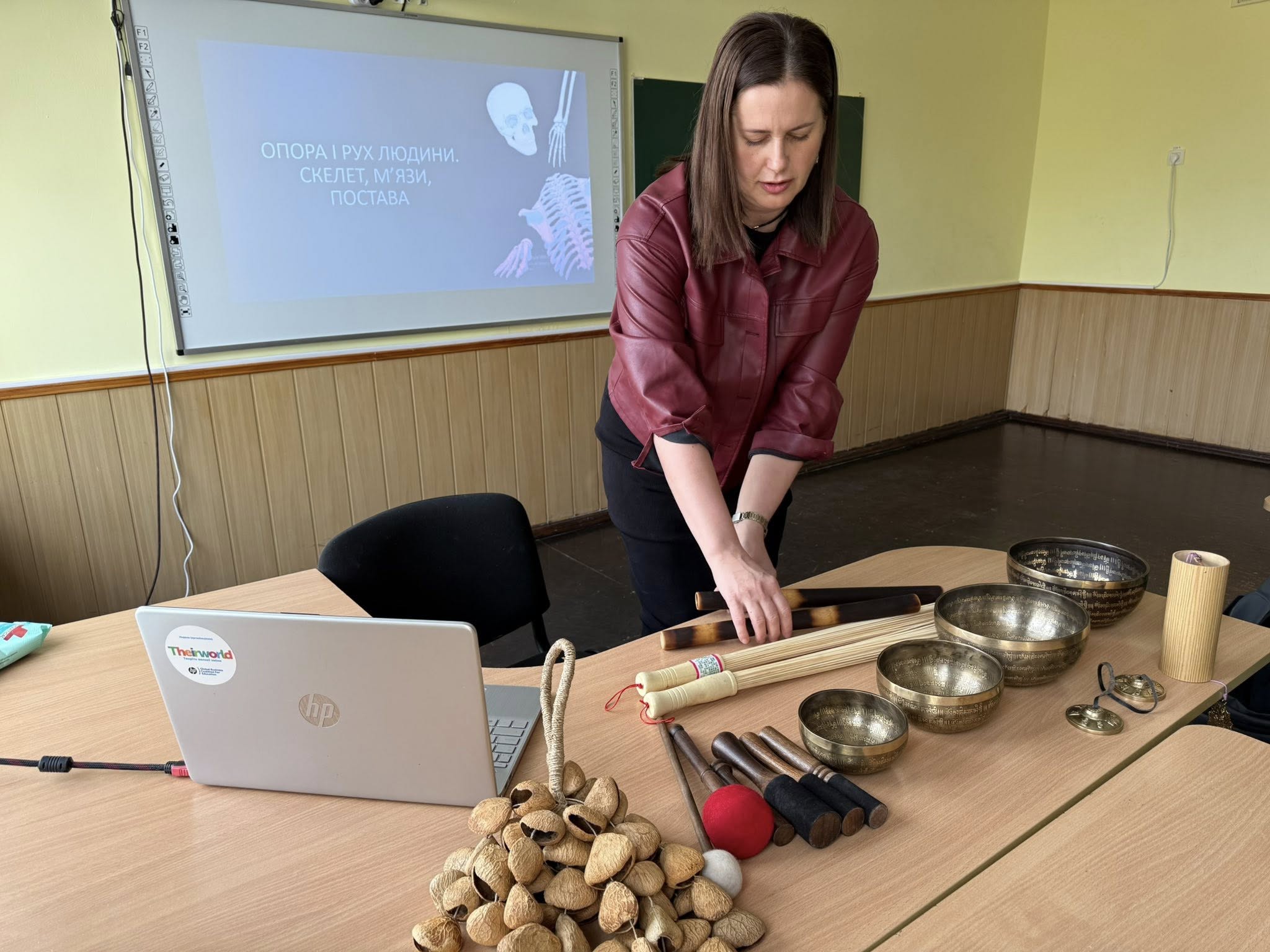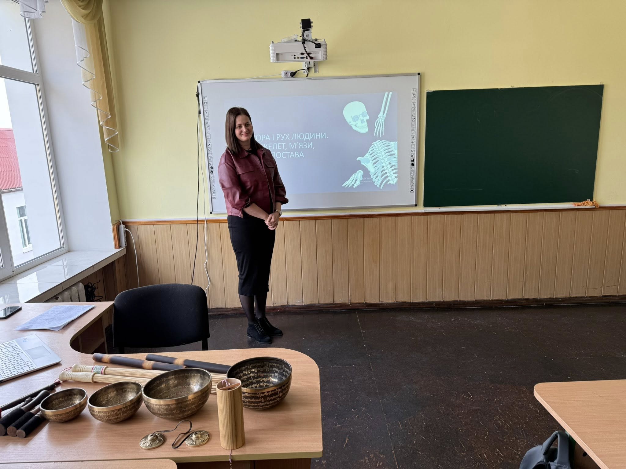 Учні 8-А класу дізналися цікаві факти про скелет: яка кількість кісток, де знаходиться найменша кістка, яка найдовша, чому ми не ламаємося. Вікторія Йосипівна захопливо розповіла про будову скелета людини. Діти спробували за допомогою співочих тибетських чаш та слухової звукотерапії зняти стрес.